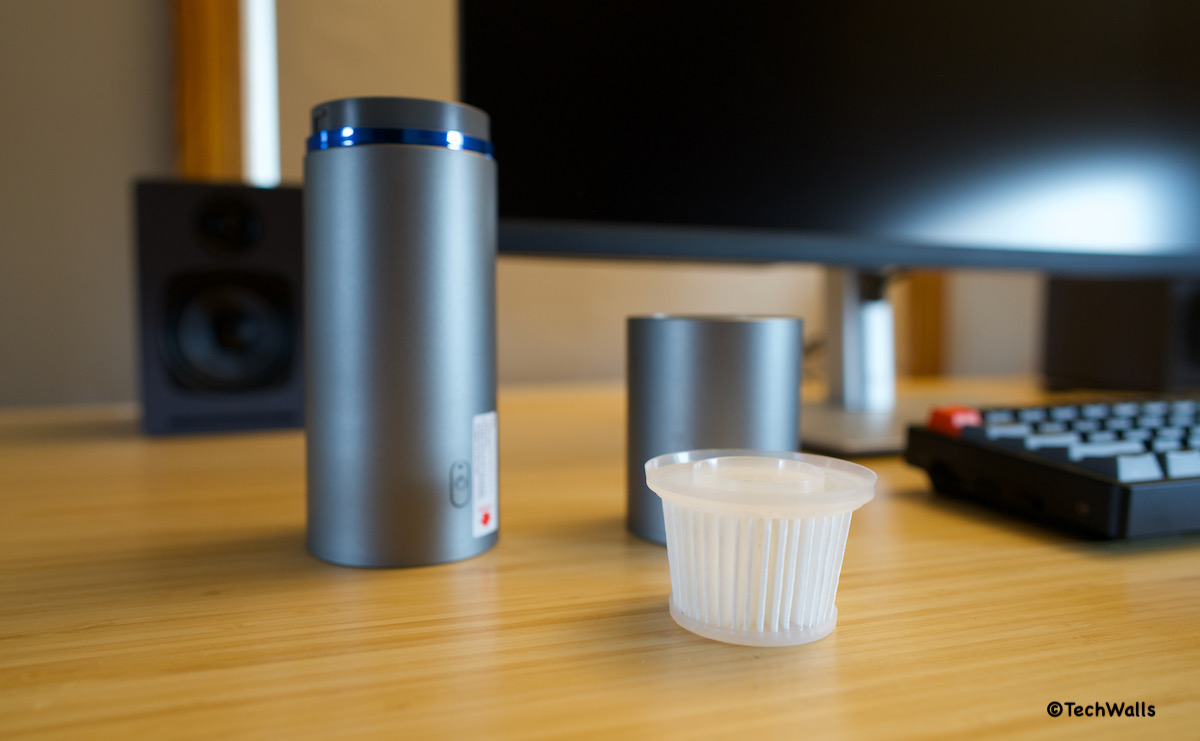 The device has a very good build quality and I love its sleek design. You can stand it up on your desk, so it has very small footprint and you can grab it quickly when you need to clean something. There are 2 slots on 2 ends of the device, one slot is blowing out air and one slot is sucking in for vacuuming. The dust bin is easy to remove with twist and since it uses a washable HEPA filter, you don’t need to replace it periodically.