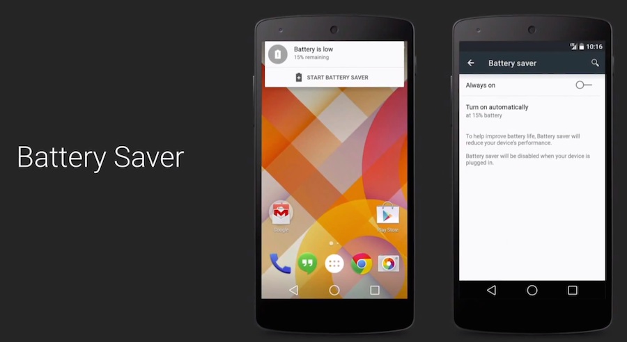 So users should be expecting a new Battery Saver mode in the upcoming version of Android that will lower the brightness of the screen and reduce CPU speeds in order to gain an extra few hours of battery life depending on the situation. Google said that Nexus 5 on battery saving mode can attain up to 90 minutes of extra battery life.