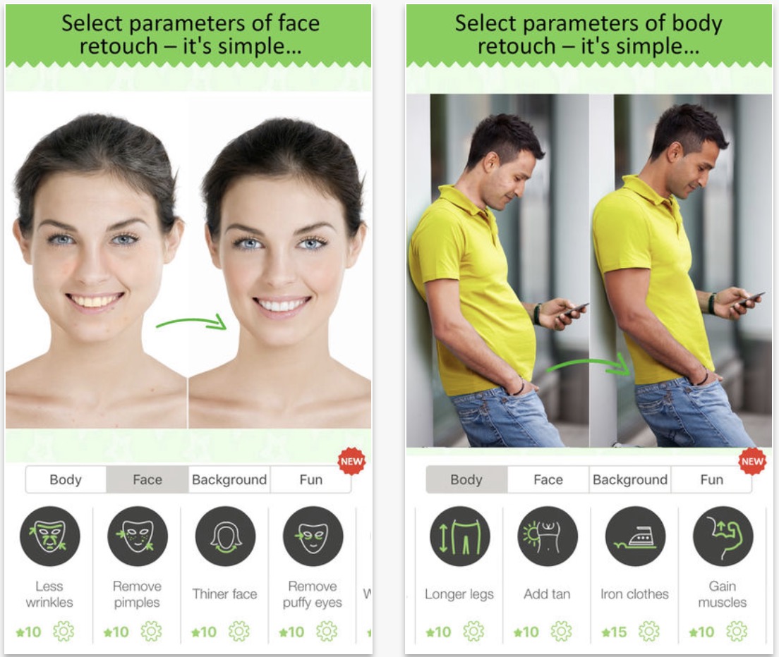 The body editing app allows the user to use its editing features to do so much for example: removing pimples and wrinkles from your face, changing the size of your legs so they appear smaller or larger, reducing the size of your tummy and giving yourself a tiny waist or a flat stomach, and eliminating fat folds and toning your body.
